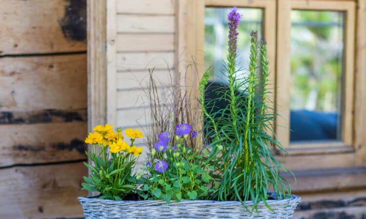 Součástí kombinované sestavy trvalek v košíku je (zleva) krásnoočko, zvonek karpatský a litra klasnatá. V pozadí se vyjímá okrasná tráva ostřice Buchananova s nápadnými hnědavými stébly.