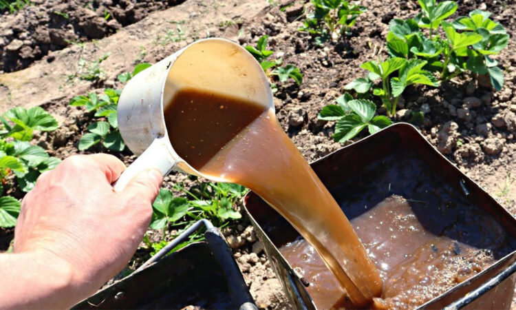 Nálev provádíme v poměru 2 kg hnoje na 10 litrů vody. Potom rozřeďte každý litr výsledného nálevu v kbelíku s vodou a záhon jahod zalijte asi 1 litrem na keř.